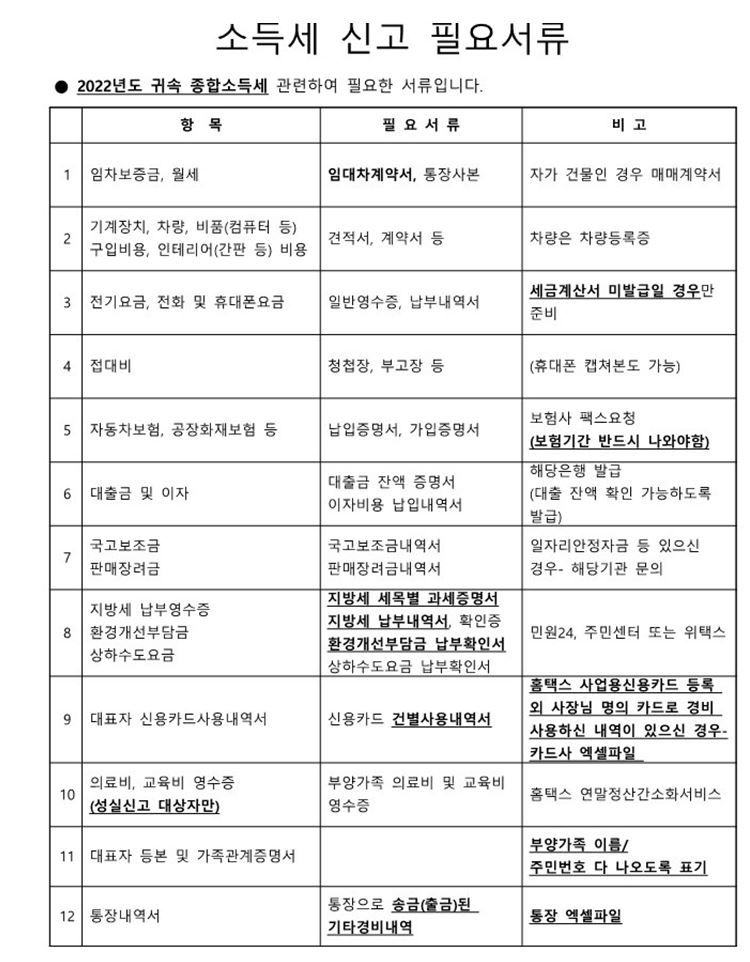 우리 세무사 사무실에서 보내준 종합소득세신고 필요서류 리스트예요.