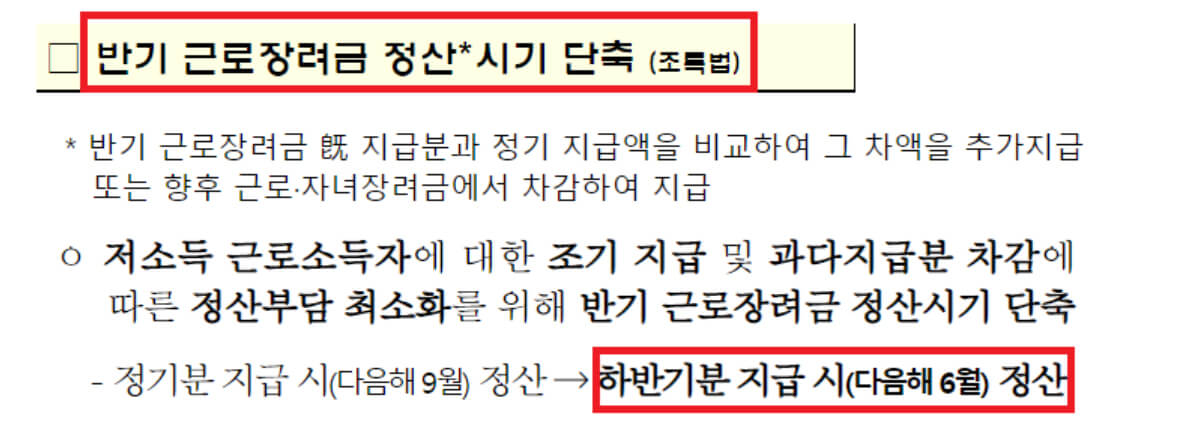 - 저소득 근로소득자에 대한 조기 지급 및 과다지급분 차감에 따른 정산 부담 최소화를 위해 반기 근로장려금 정산 시기를 단축한다고 합니다.