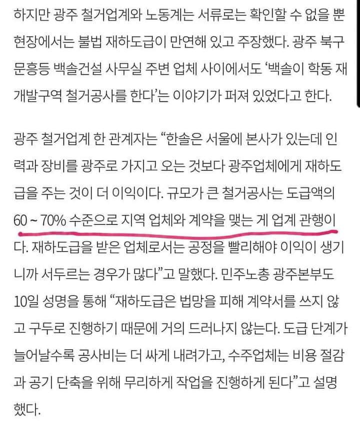 시공 능력이 떨어지는 곳에 사업을 맡길 수밖에 없는 복합적인 이유, 이런 사고가 생긴 본질적인 이유에 대해 말하는 곳이 없습니다.