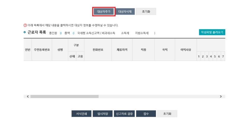 근로자 추가 시 대상자 버튼을 누르시면 근로자 목록에 근로자가 추가됩니다.