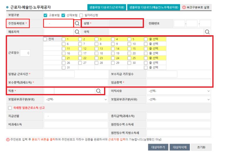 보험 구분을 선택하시고 주민번호를 입력하시면 근로자 정보가 입력됩니다.