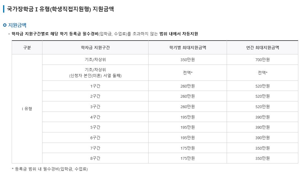 국가장학금 Ⅰ 유형 (학생직접지원형) 지원금액