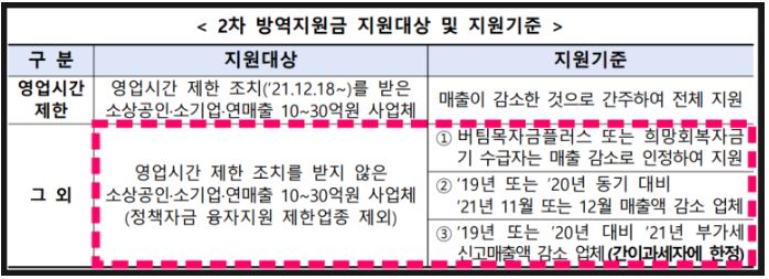 * 1차 소상공인방역지원금 신청때 연매출 10억 초과하는 음식점업, 숙박업, 교육서비스업은 제외됐으나 2차소상공인방역지원금에는 연매출 30억까지 포함.