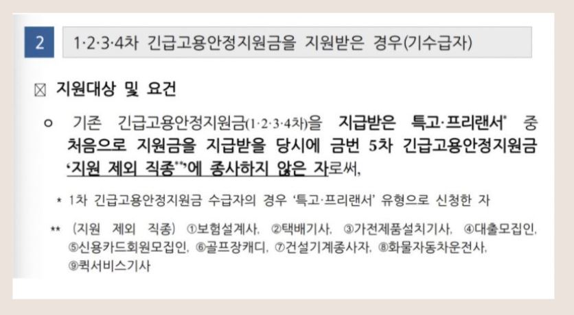 - 1~4차 긴급고용안정지원금을 받지 않은 인원들중 2021년 10월~11월사이에 소득이 발생한 프리랜서이면서 고용보험에 가입되어있지 않은자.