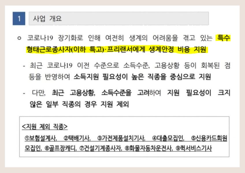 소득에 대한 열세함이 있는 직종을 대상으로 특수형태근로 종사자(특고) 프리랜서에게 생계안정 비용을 지원.