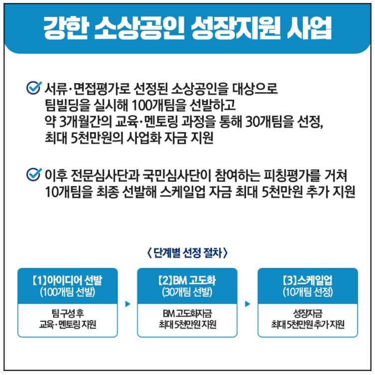 1.서류, 면접으로 100개팀 선발 -> 약 3개월간의 교육, 멘토링과정을 통해 30개팀을 선정 ->최대 5천만원 사업자금지원