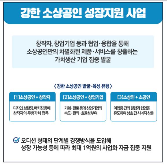 사업개요 2022 강한 소상공인 오디션 소상공인 누구나, 최대 1억원 지원! 소상공인과 창작자 / 스타트업 / 소상공인의 팀 빌딩을 기반으로, '교육, 멘토링, 상품개발 및 실질적 판매 ∙ 마케팅’ 등